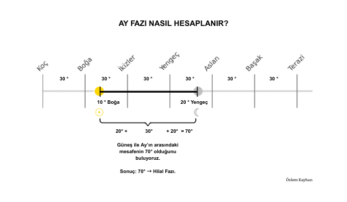 - Güneş’ten başlayıp Ay’a kadar burçları say, sonra derece farkını ekle.